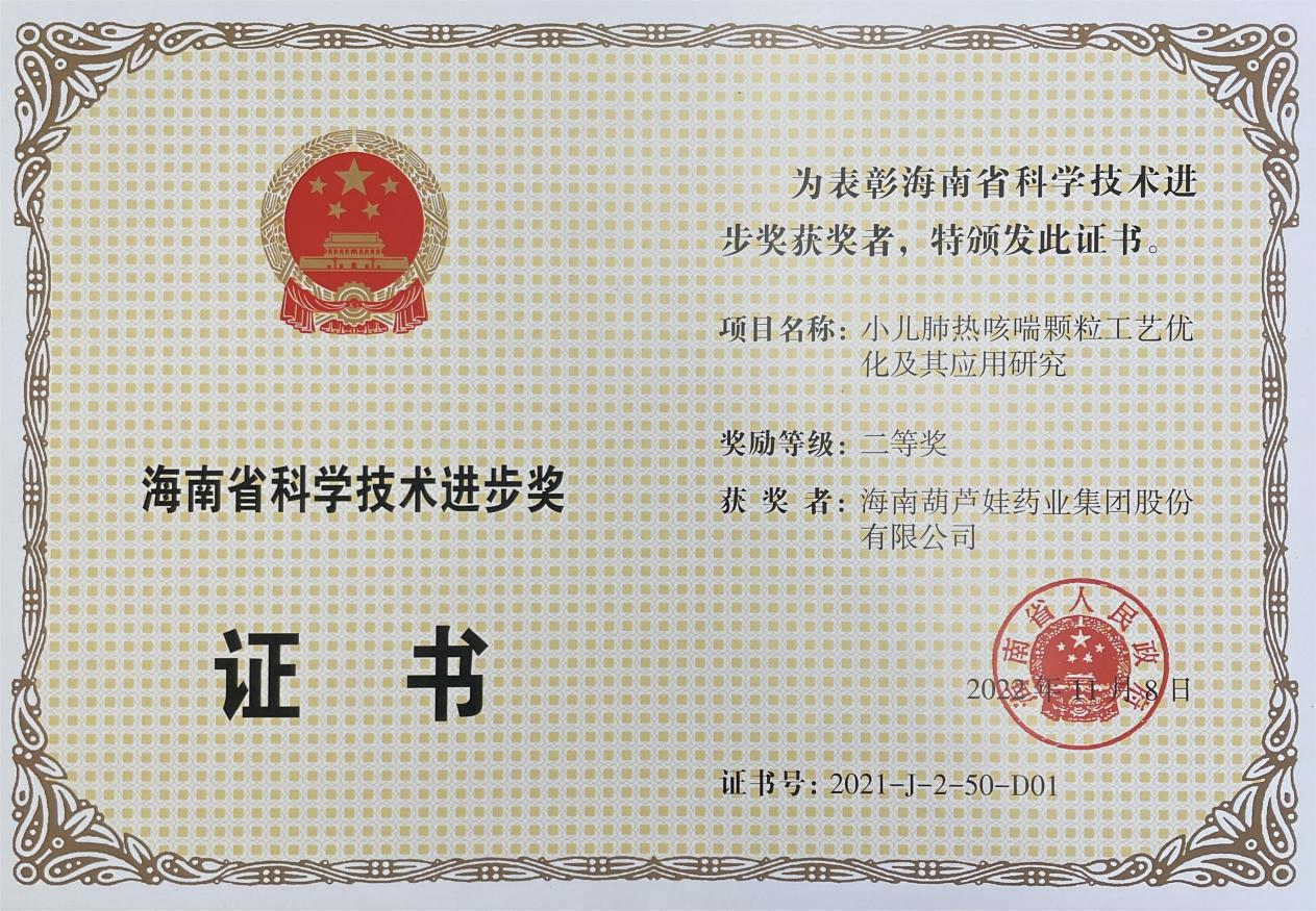 为此,小儿肺热咳喘颗粒的制备方法获得了第二十一届中国专利优秀奖(2019年),专利申请号:ZL201010134951,此次作为专利技术的应用,获得了2021年度海南省科学技术进步奖二等奖。在此之前,7790必发集团牌小儿肺热咳喘颗粒还多次被授予“临床价值中成药品牌”、“中国连锁药店最具合作价值单品”,荣登“中国医药品牌榜”。